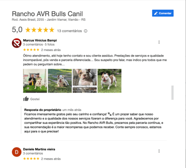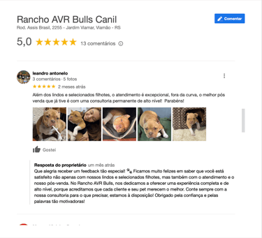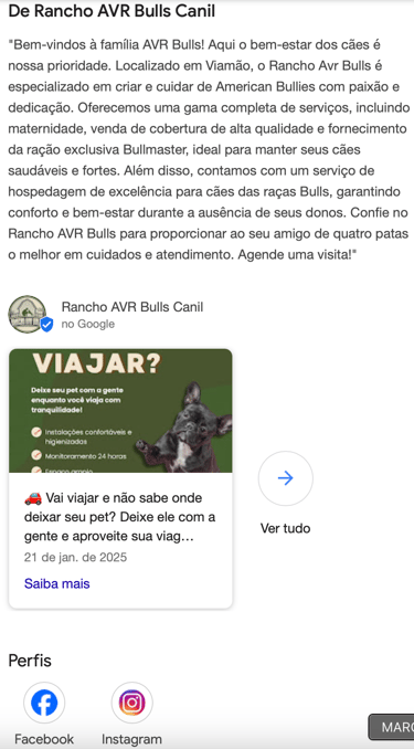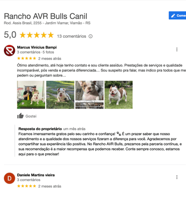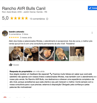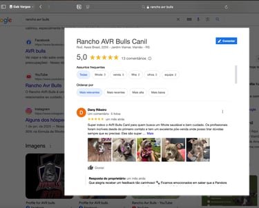 O Rancho AVR Bulls conquistou maior visibilidade nas buscas do Google, atraindo clientes qualificados tanto para a criação de American Bullies quanto para o hotel para cães, consolidando sua presença digital e ampliando as oportunidades de negócio.